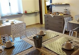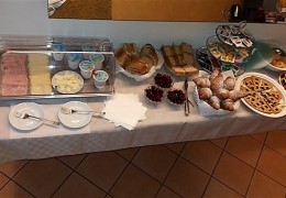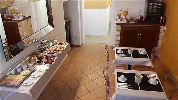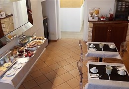 Al mattino la Hall si trasforma per la Colazione. E' completamente apparecchiata a Buffet con Biscotti,