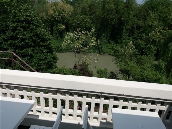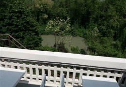 Vi è poi una terrazzina con sedie e tavoli ad uso non esclusivo che si affaccia sull'ampio giardino e sul fiume sottostante.